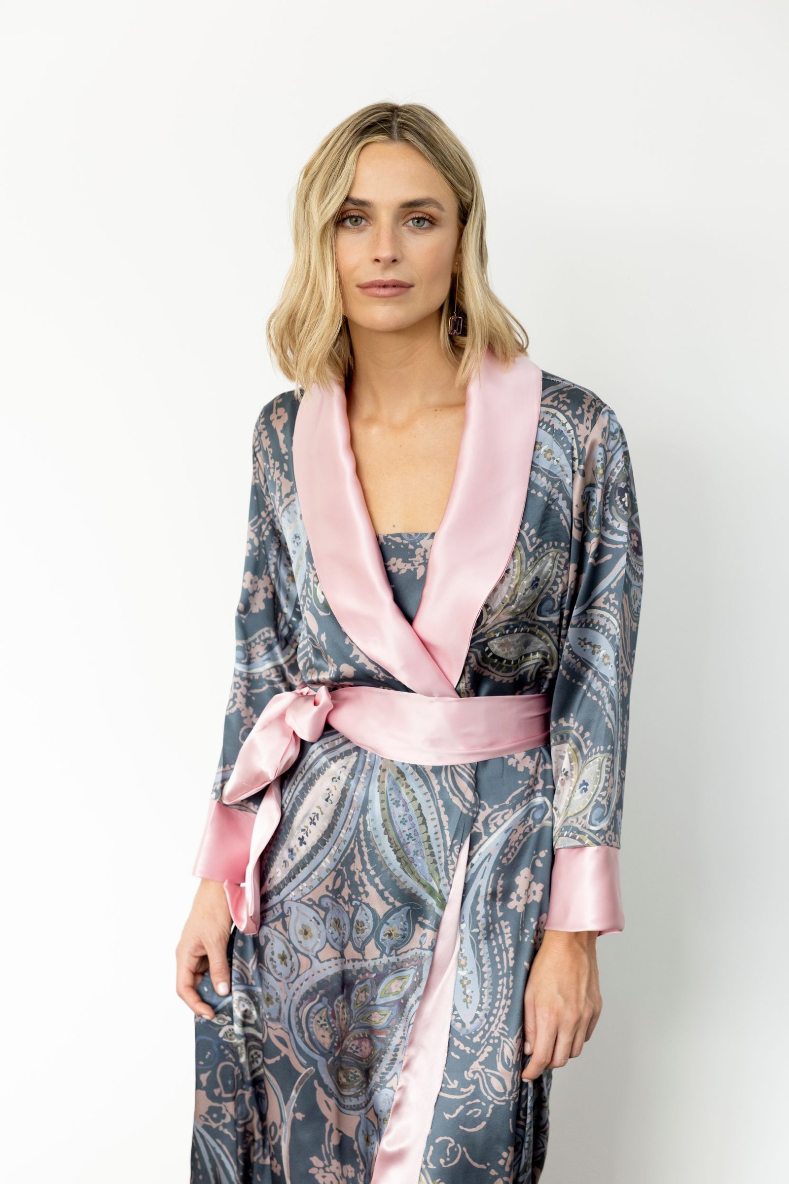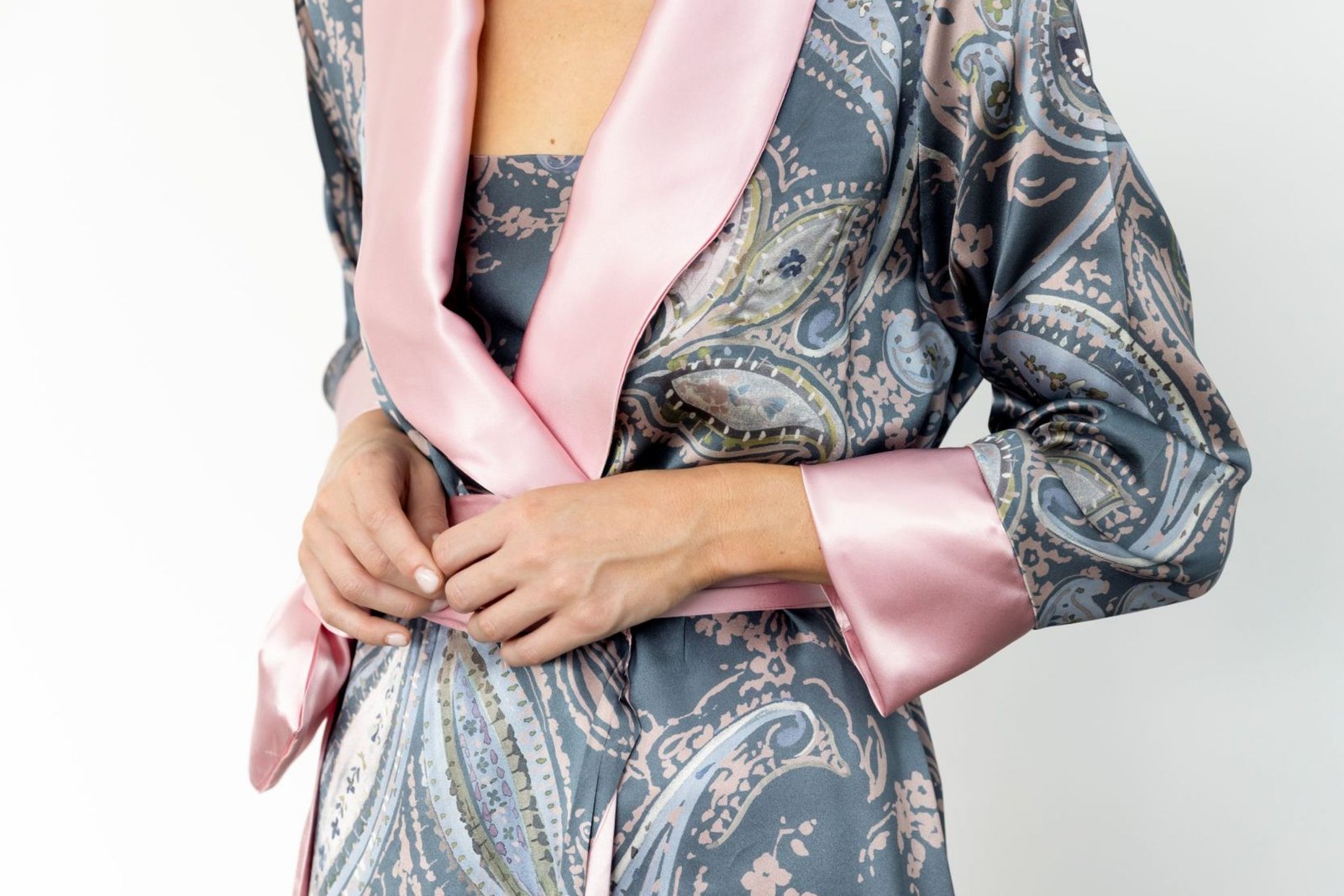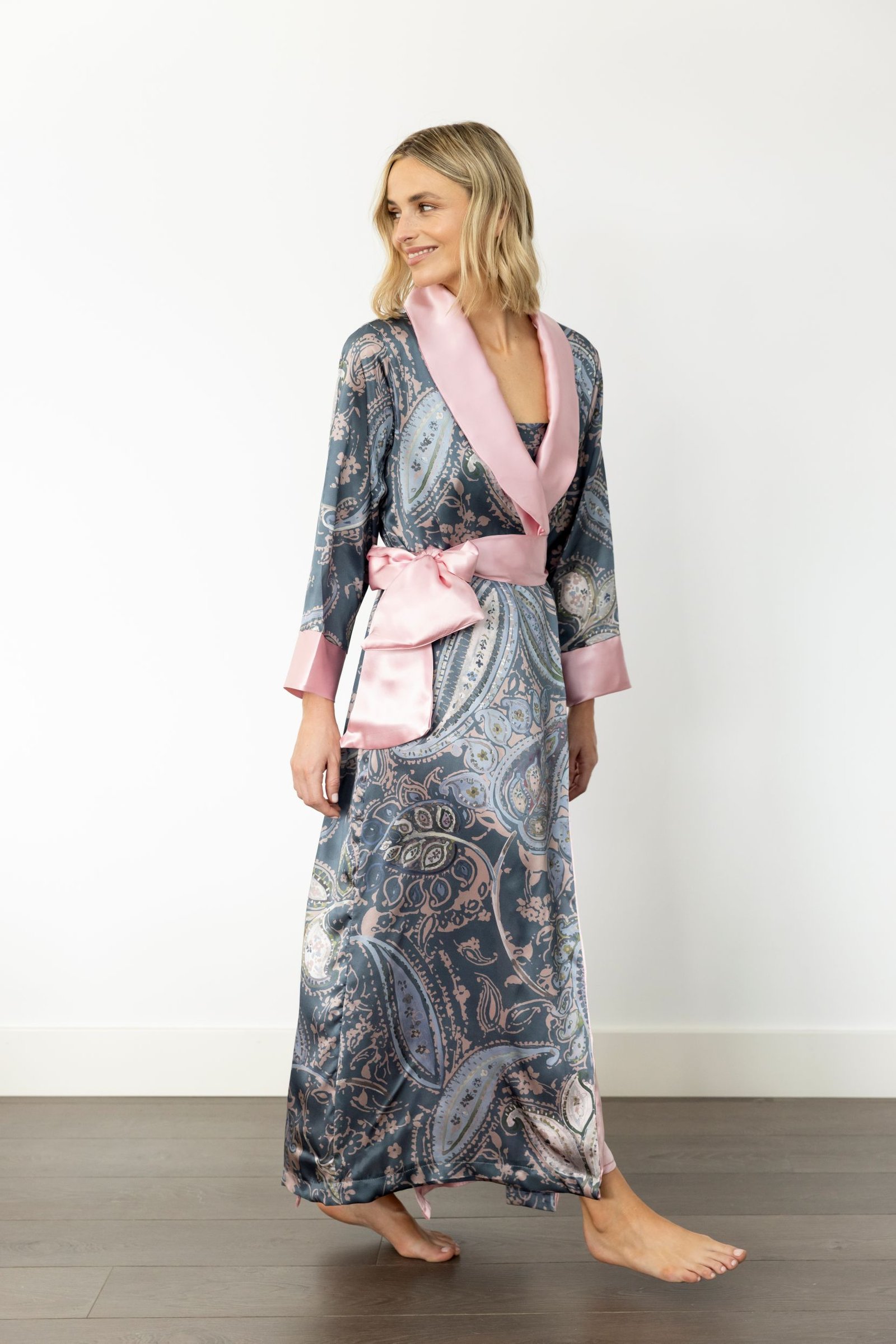 • Bata de seda italiana estampada en tonos grises, con cuello smoking, puños y cinturón en delicada seda rosa claro, haciendo contraste.