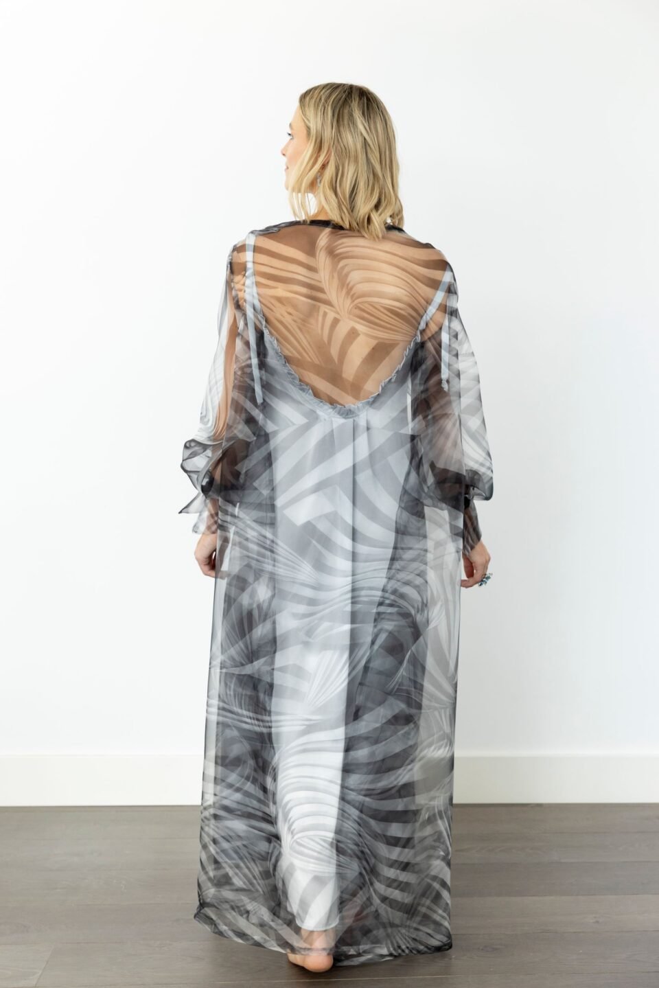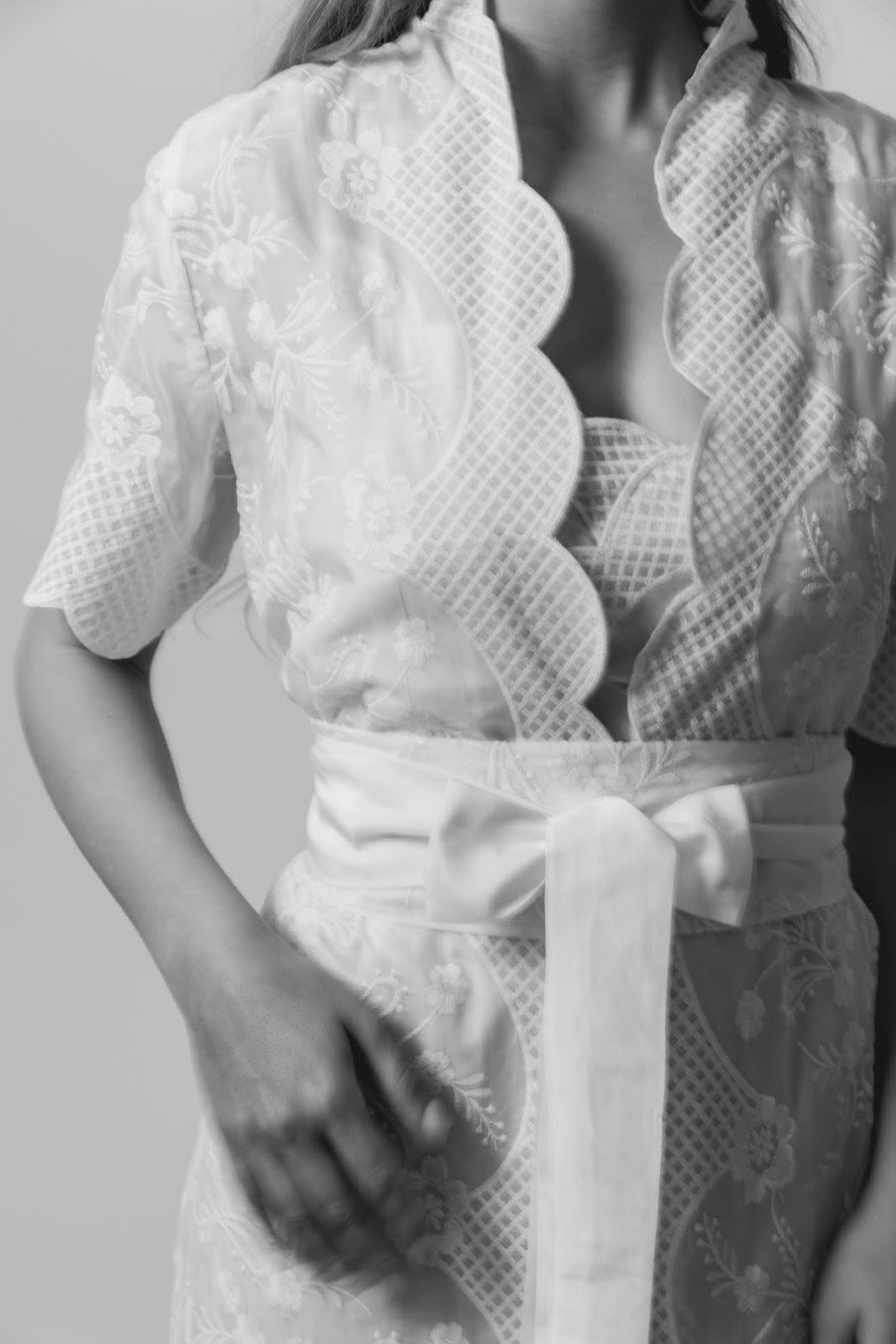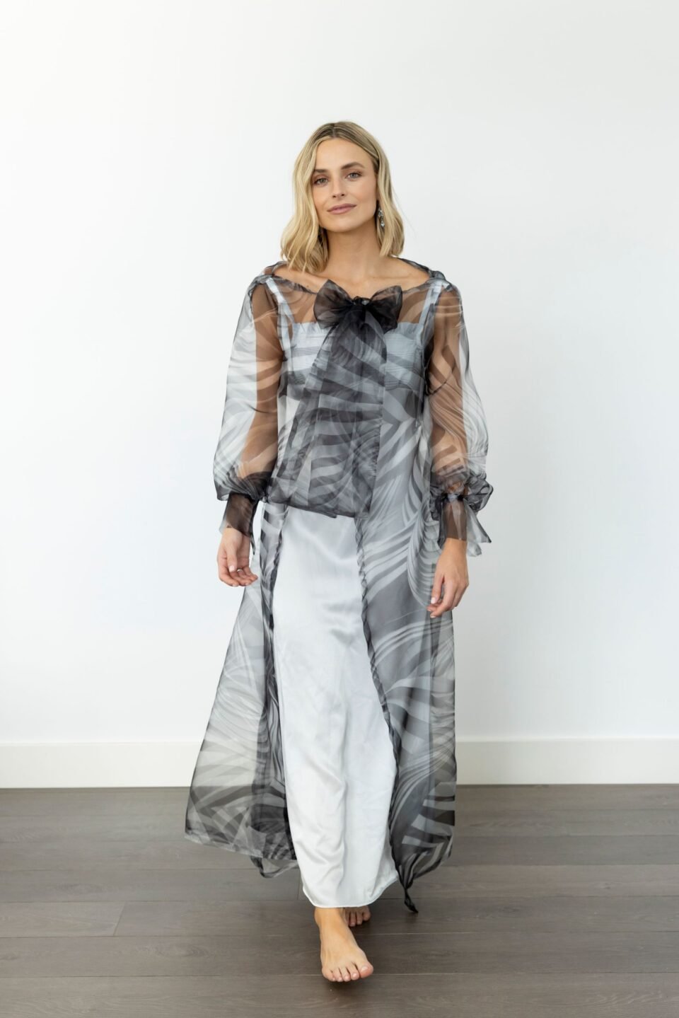 • Bata de seda italiana estampada en tonos grises, con cuello smoking, puños y cinturón en delicada seda rosa claro, haciendo contraste.