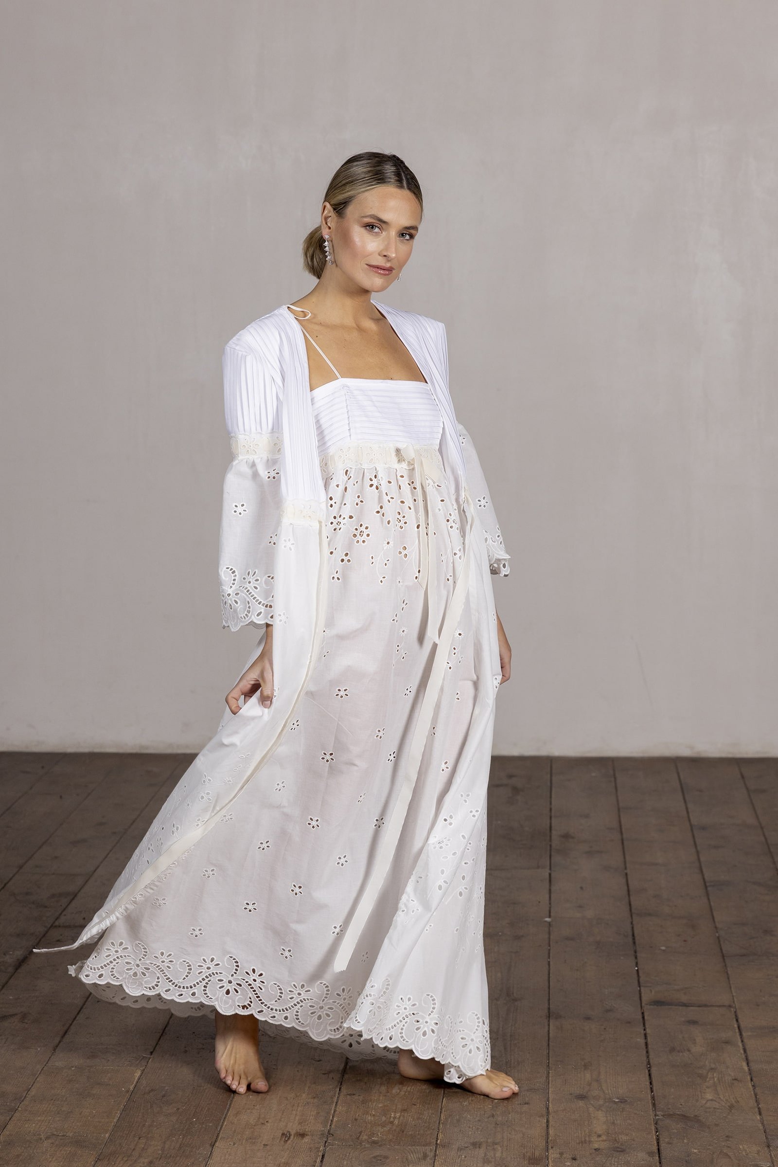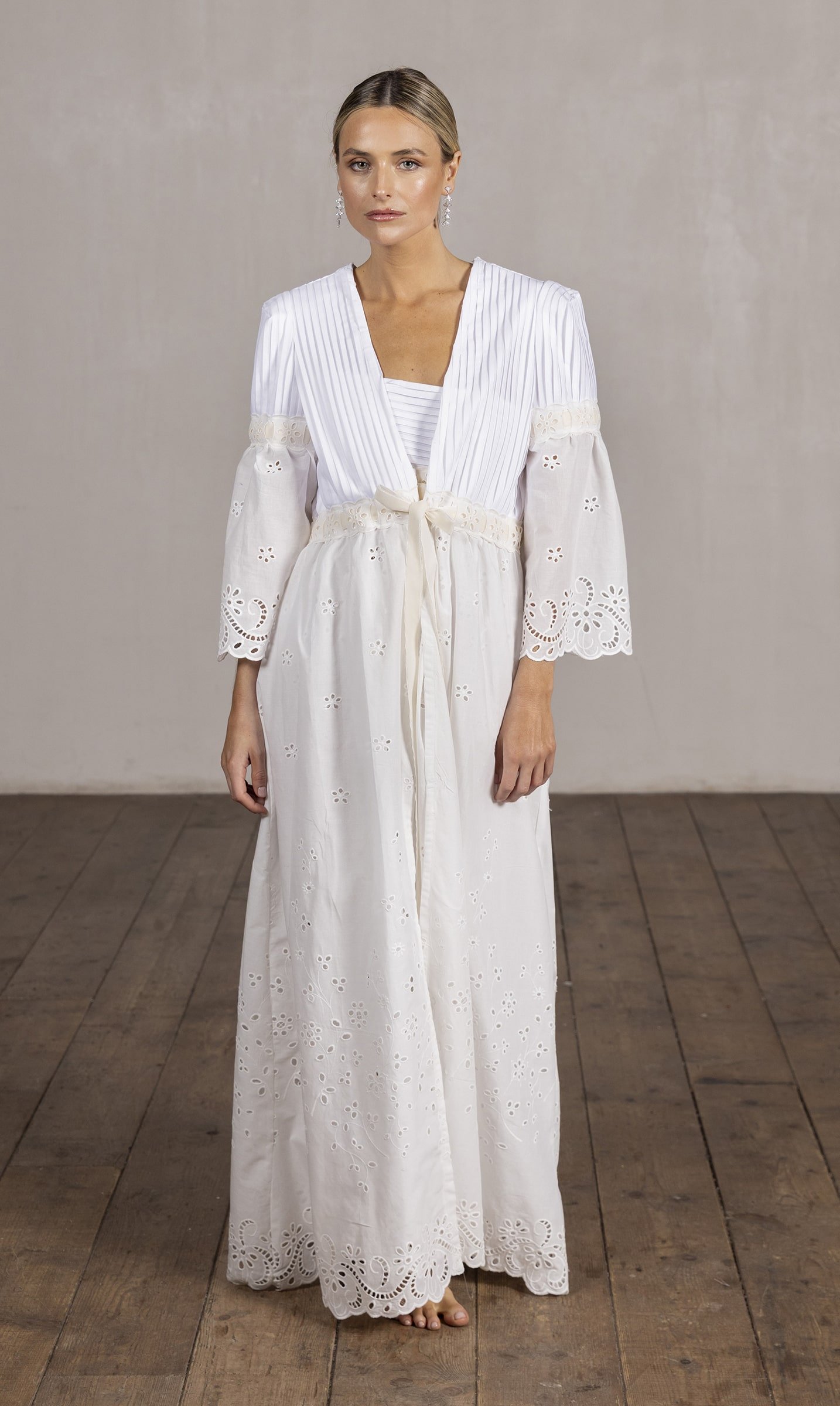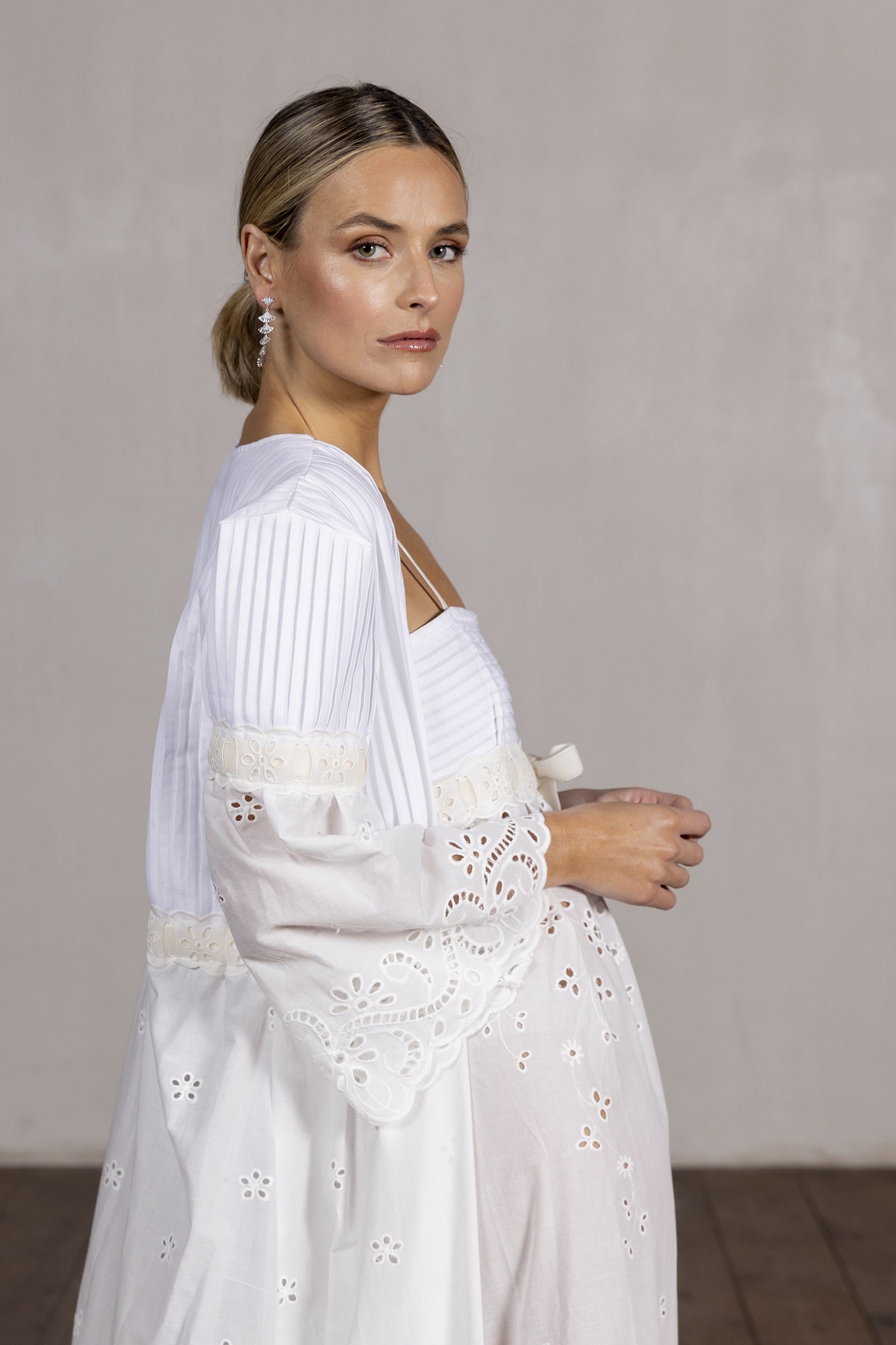 • Exquisita bata confeccionada en batista de algodón blanco con delicadas jaretas.