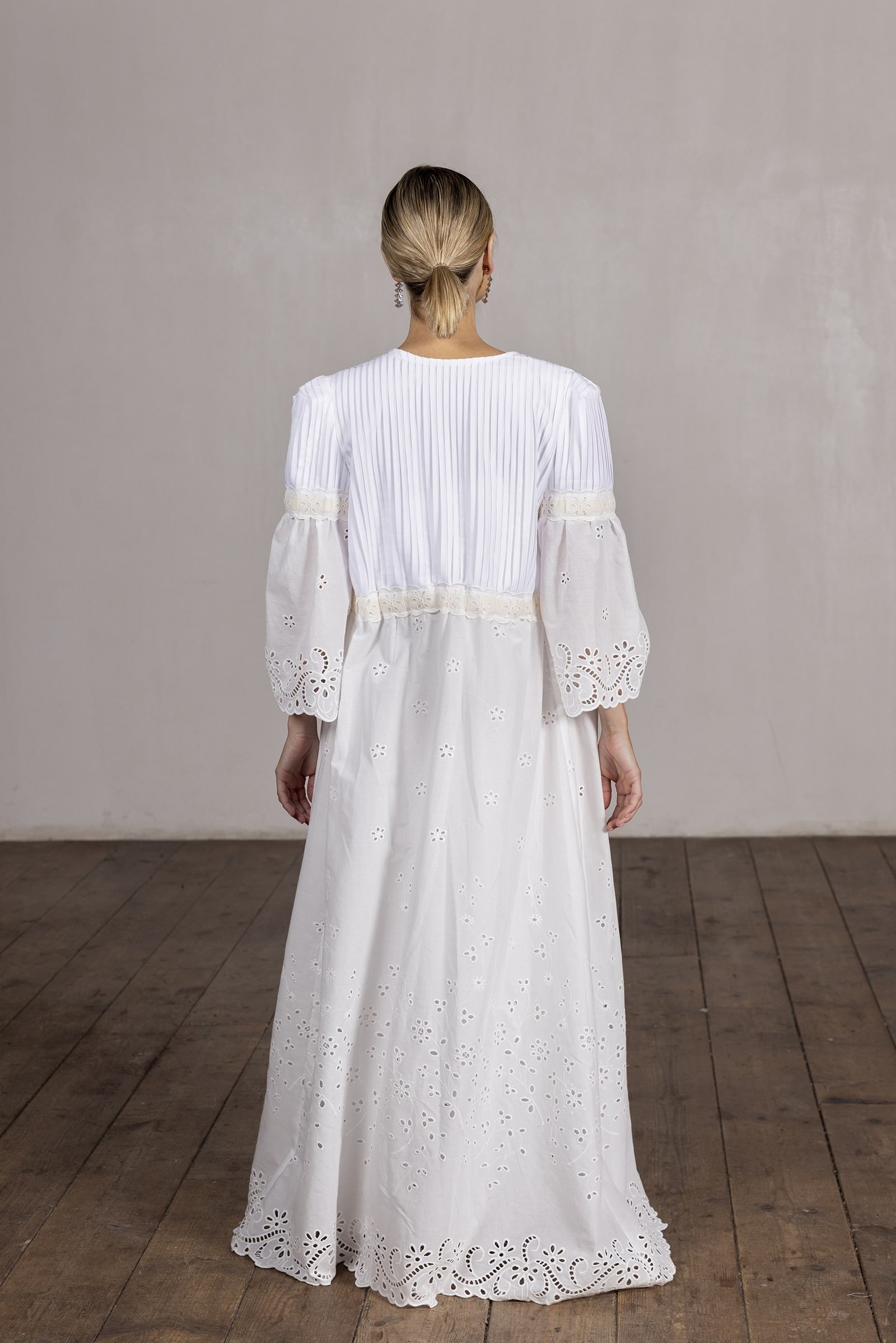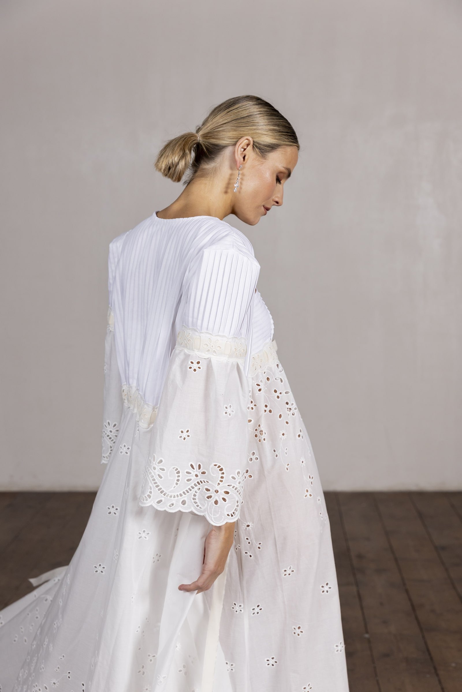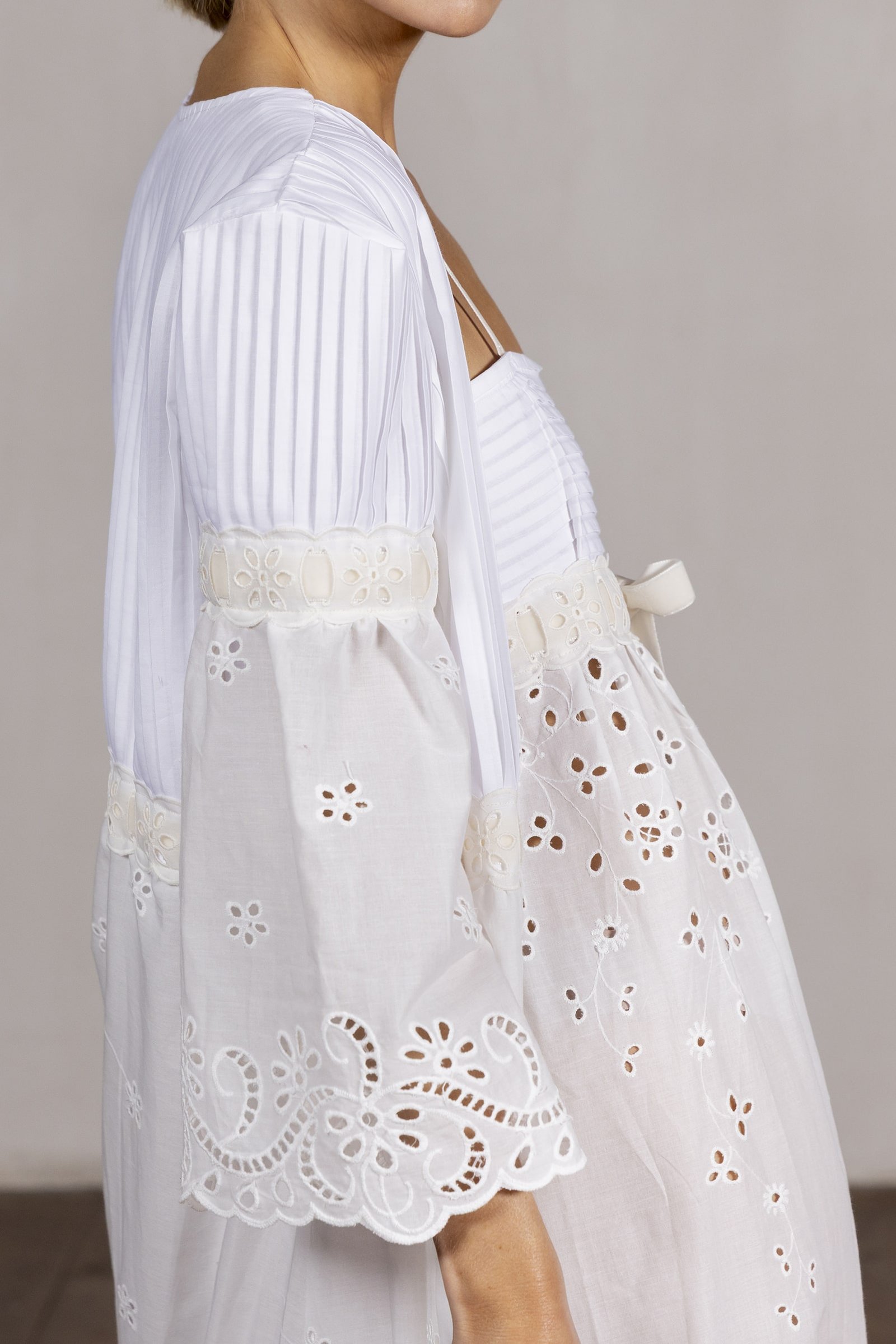 • Su falda plisada en batista bordada color crudo aporta movimiento y sofisticación.