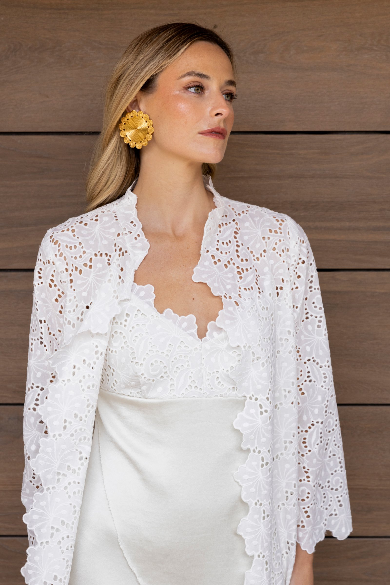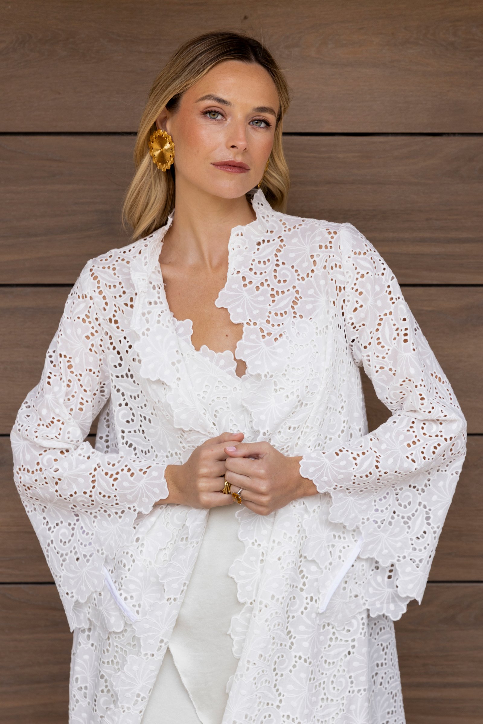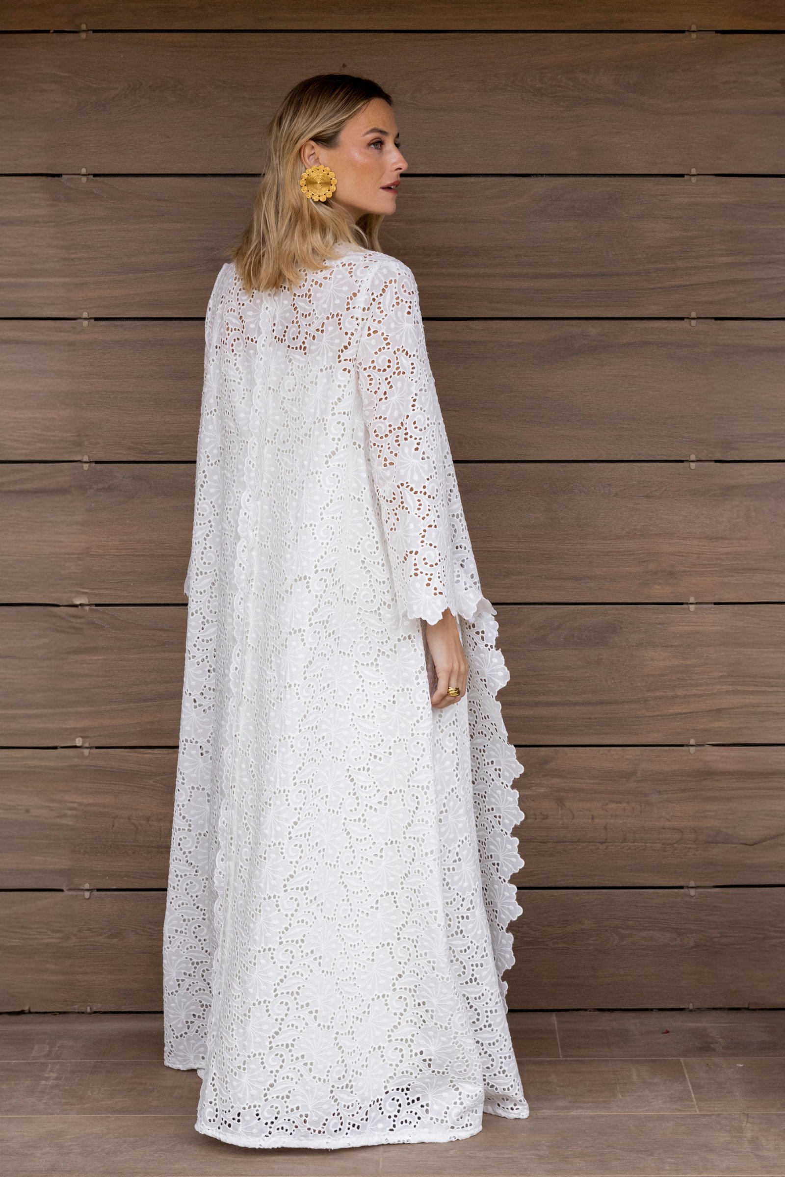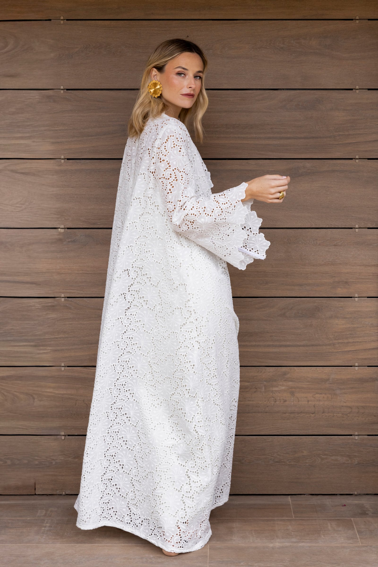- Ligera y refinada, esta bata está confeccionada en batista de algodón bordada, con un corte recto que realza la sencillez de su silueta.