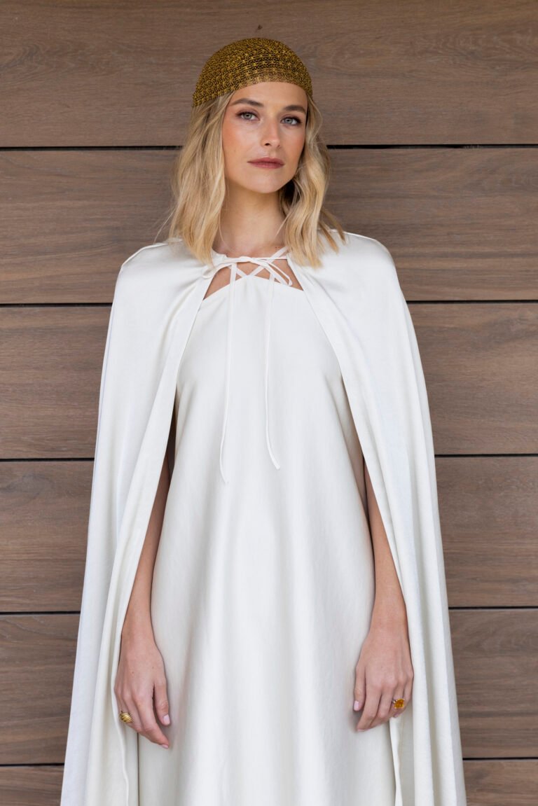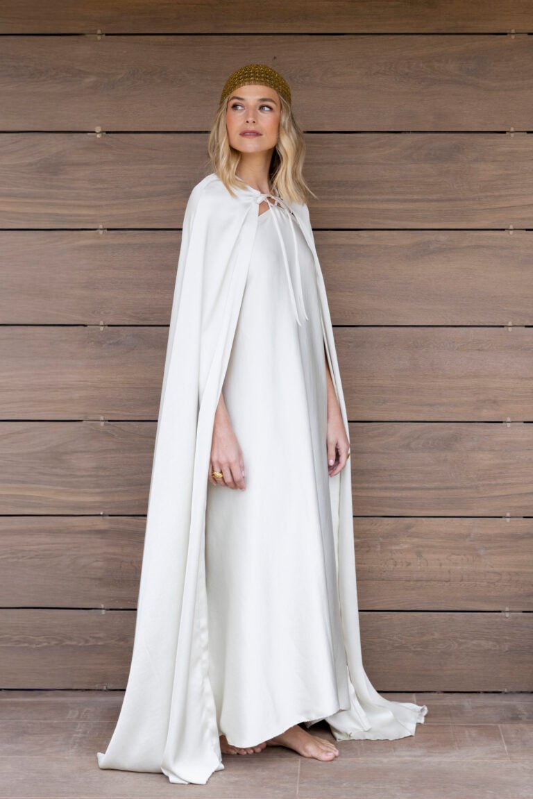 • Una pieza envolvente y delicada, confeccionada en piel de ángel, tejido ligero y translúcido de tacto sedoso. Su diseño con forma de capa, cortado al bies para aportar fluidez y movimiento, se cierra con una lazada en el cuello que realza su aire romántico.
