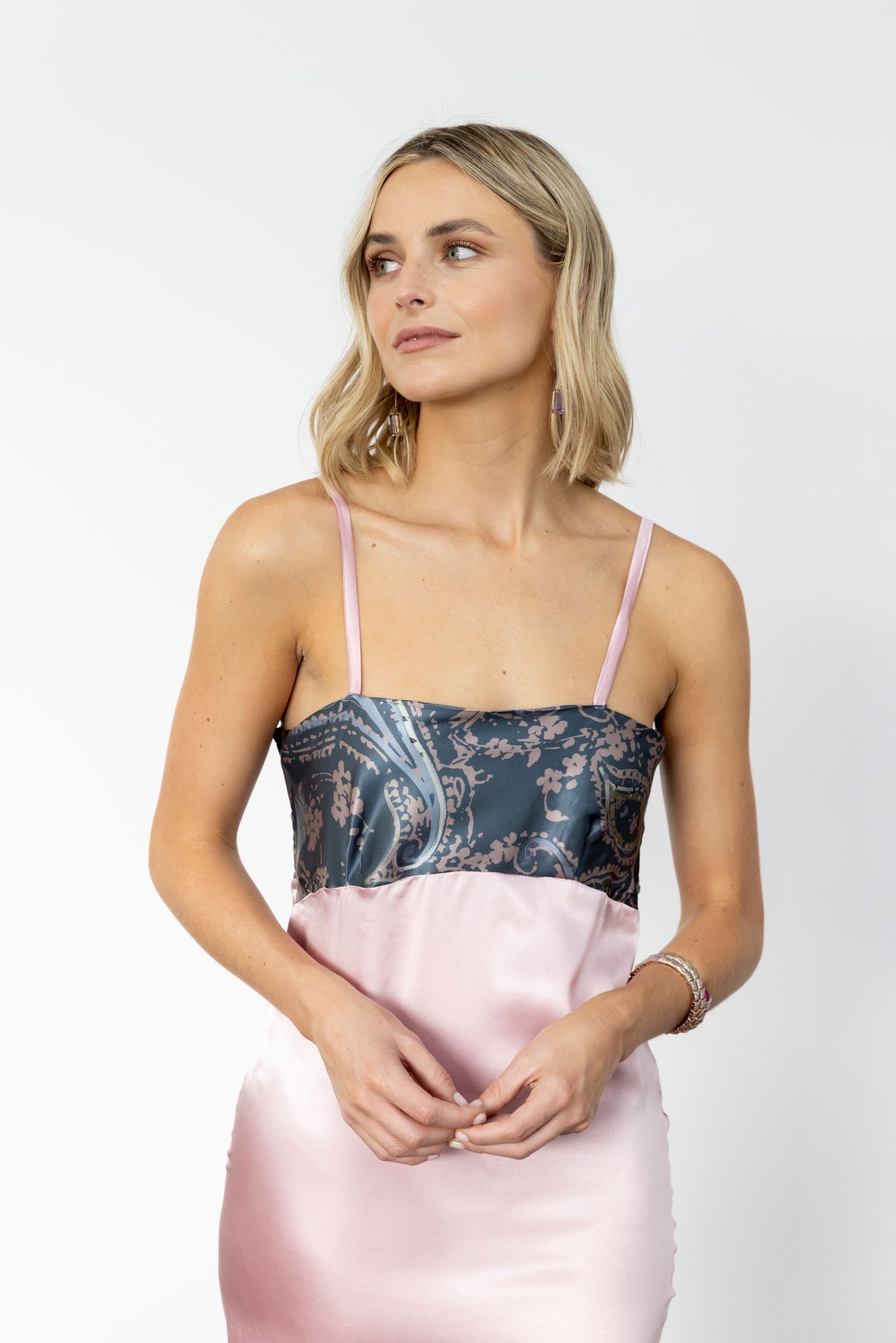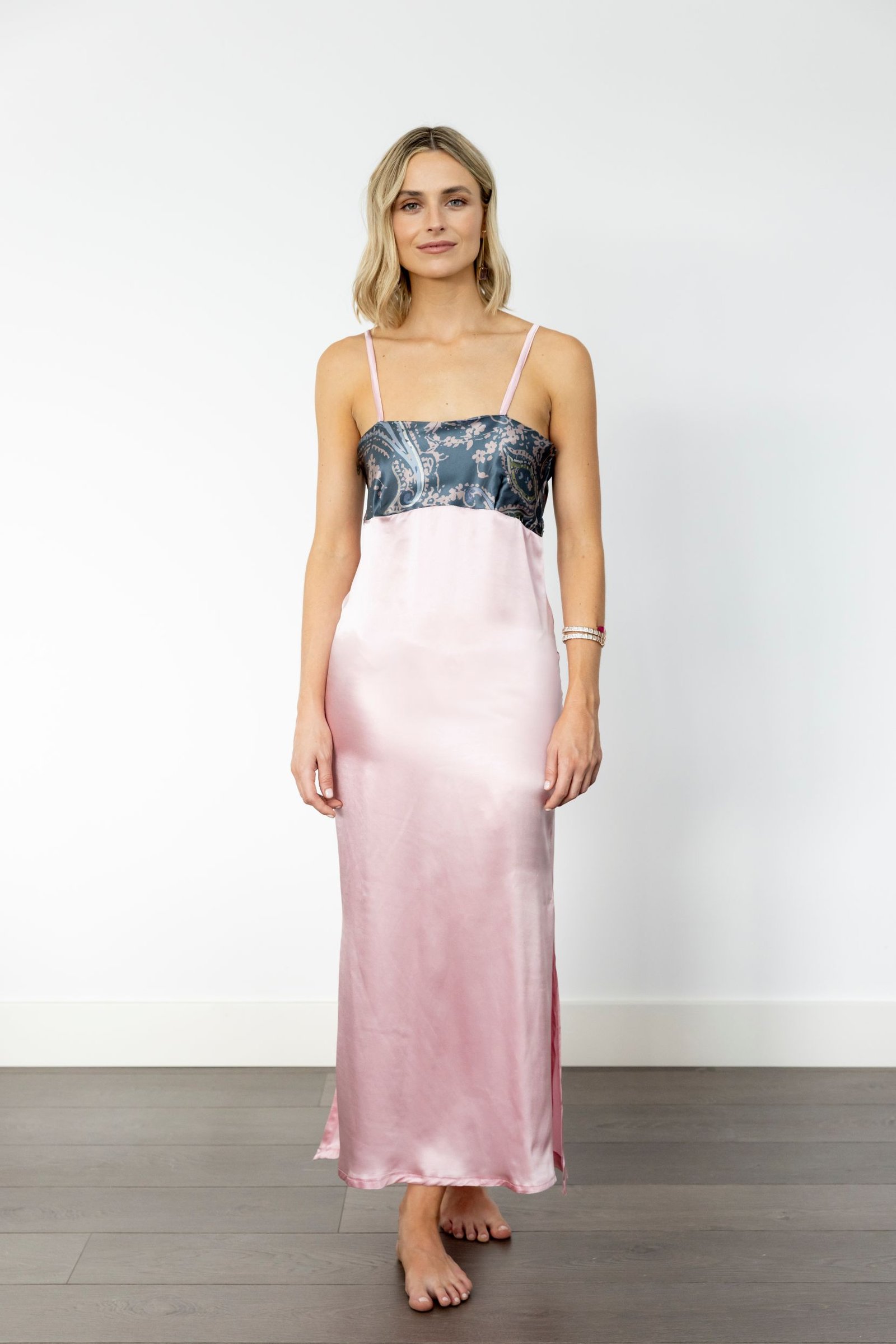 • Camisón en seda italiana con corte bajo el pecho y escote recto en tonos grises y rosas, diseñado a juego con la bata Allegra.