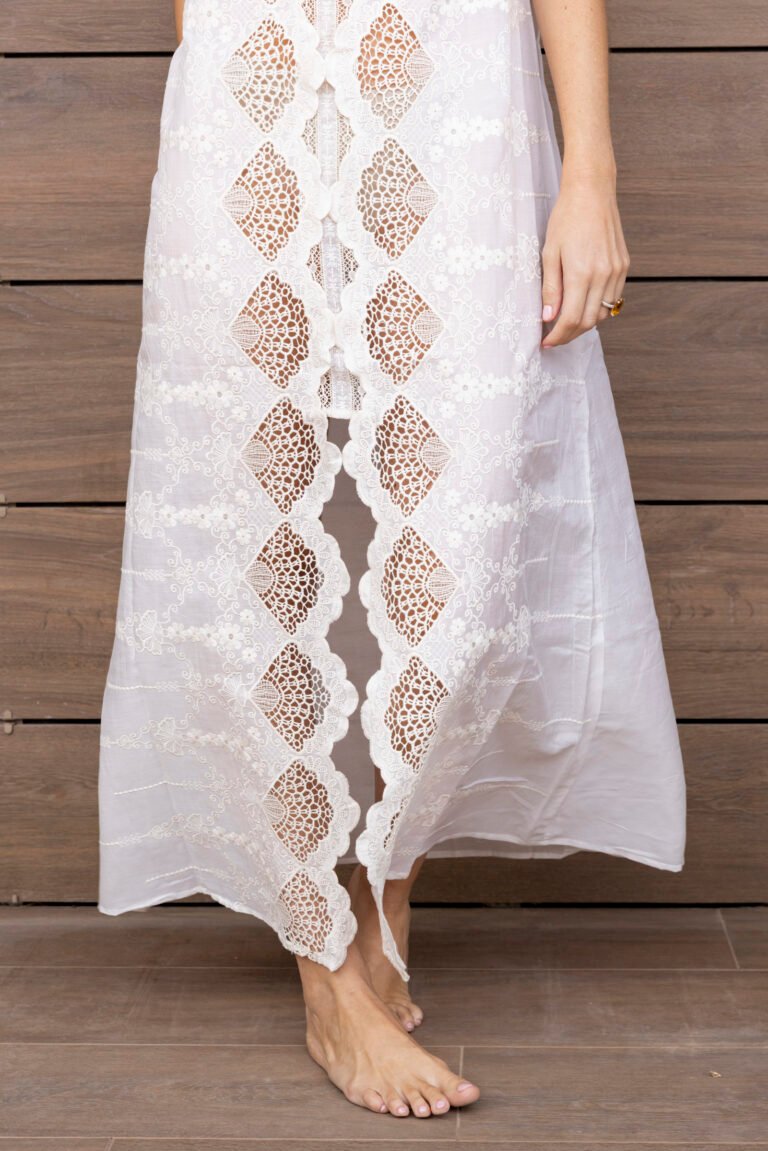 • Camisón largo confeccionado en seda bordada con dibujo de rombos, unida en el centro mediante una tira bordada a modo de entredós que recorre toda la prenda desde el escote hasta el bajo.