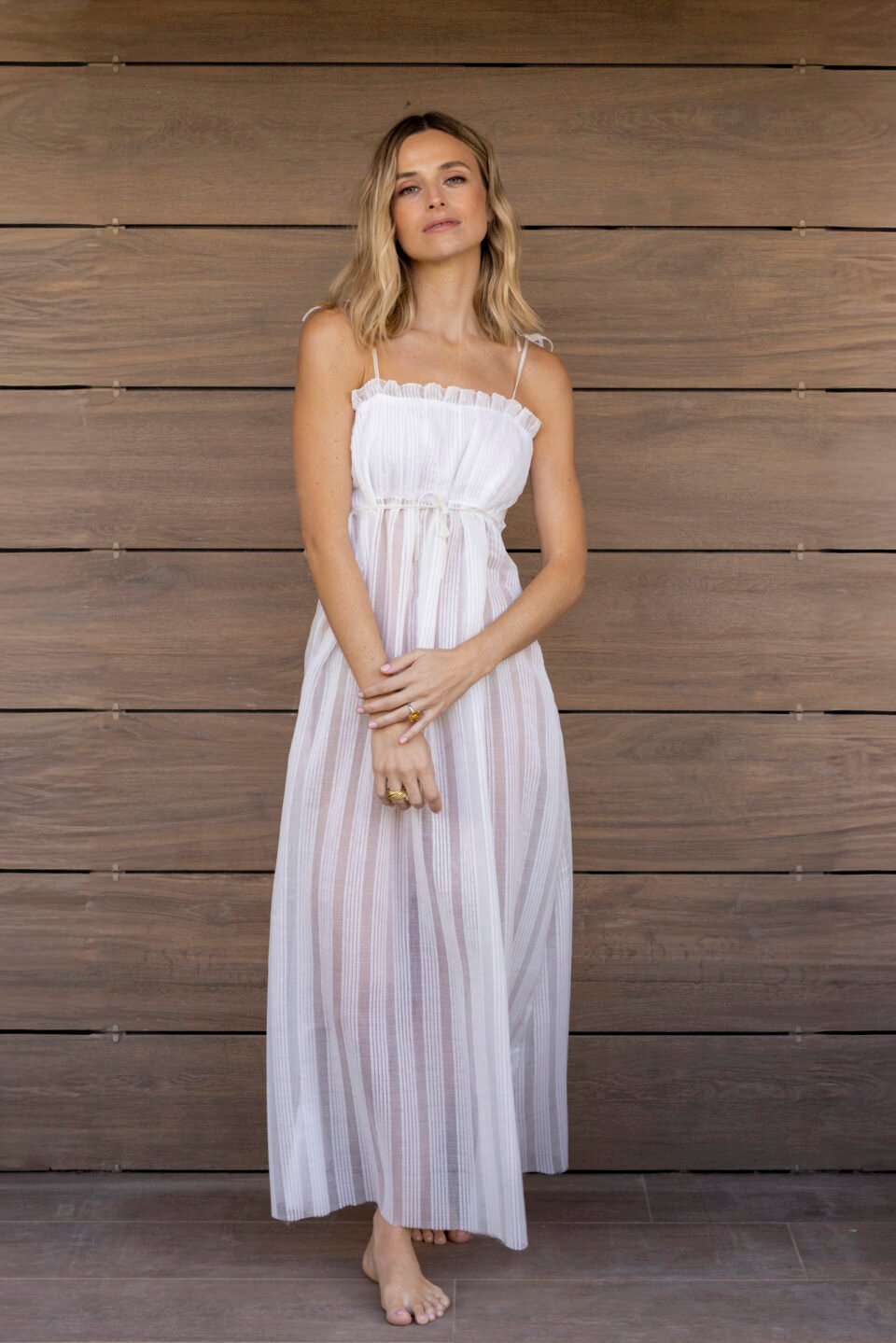 • El escote recto con finos tirantes ajustables con lazada aporta delicadeza y feminidad, mientras que la falda con vuelo y abertura delantera añade ligereza y movimiento.