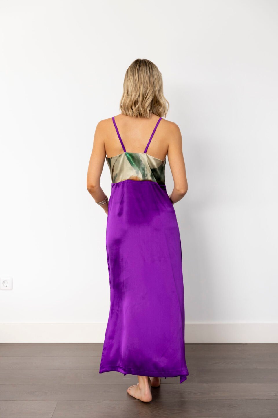 - Cuello recto y tirantes en lazo de terciopelo.