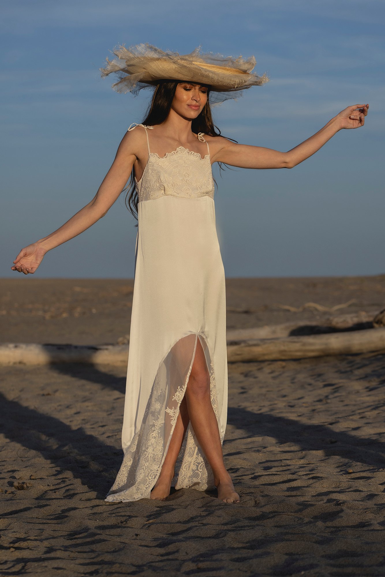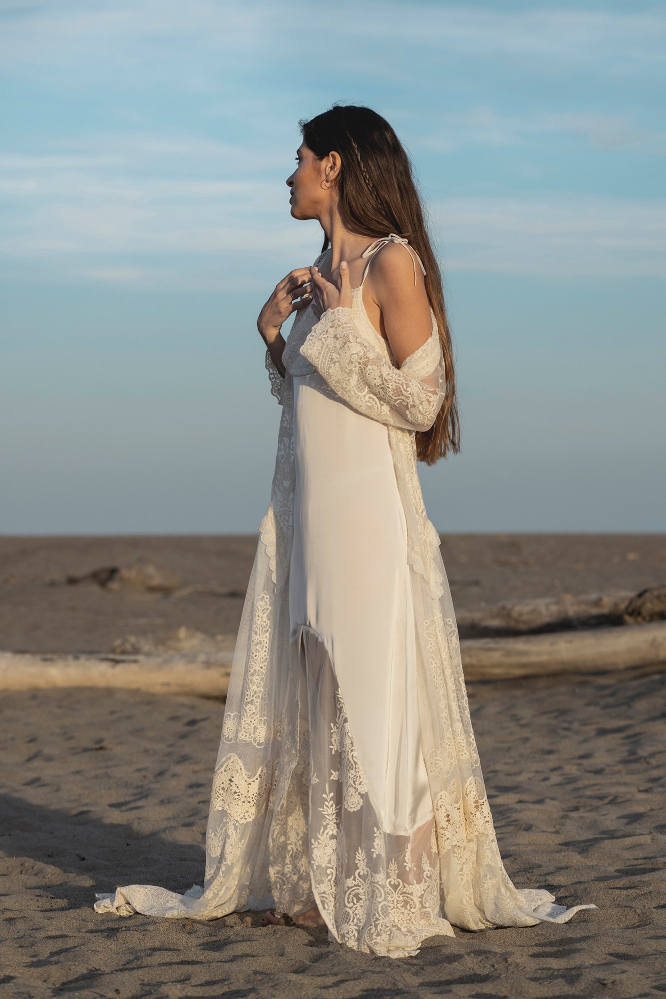 - Acabado con abertura frontal en tul bordado.