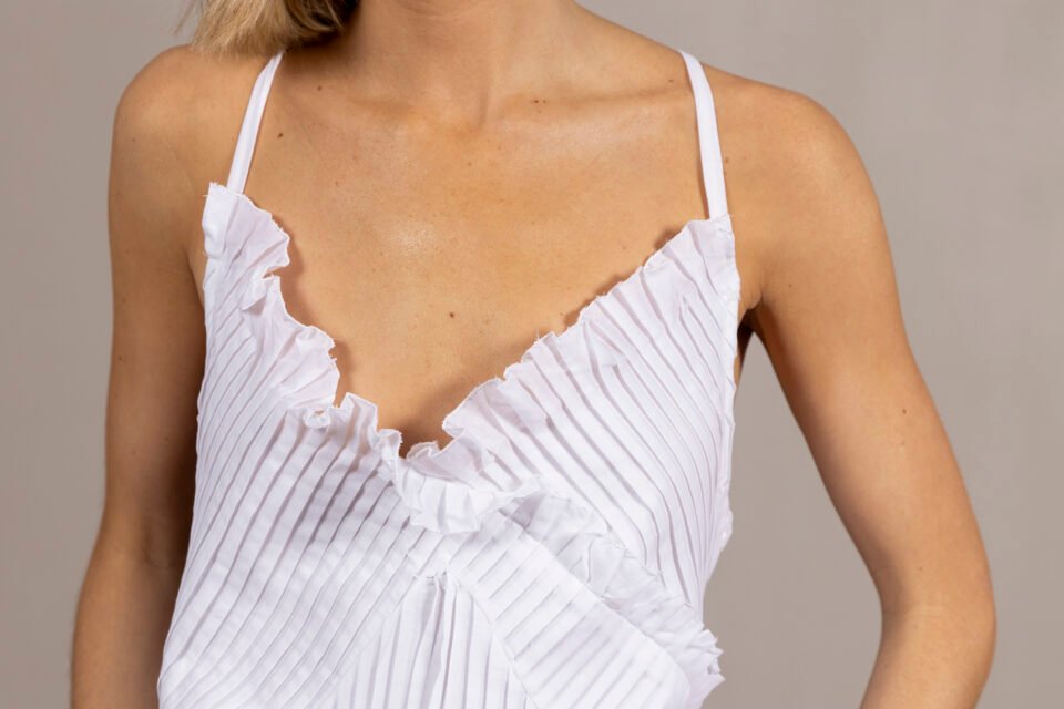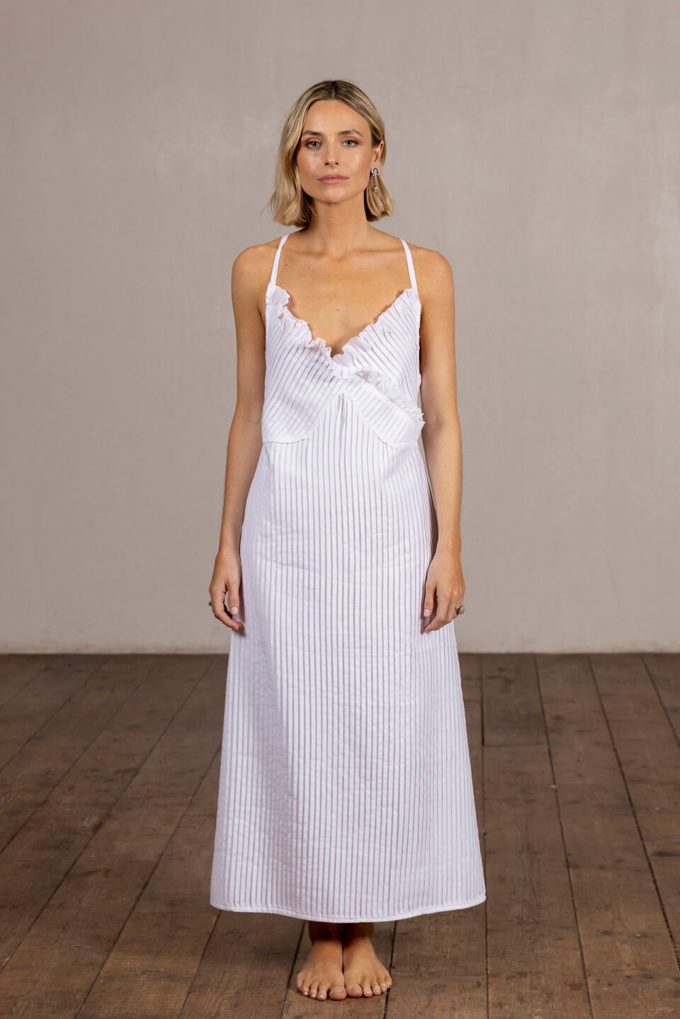 - Los laterales con tira bordada y pequeñas aperturas aportan ligereza y movimiento, mientras que los tirantes de bordado en algodón completan el diseño con un toque artesanal y romántico.