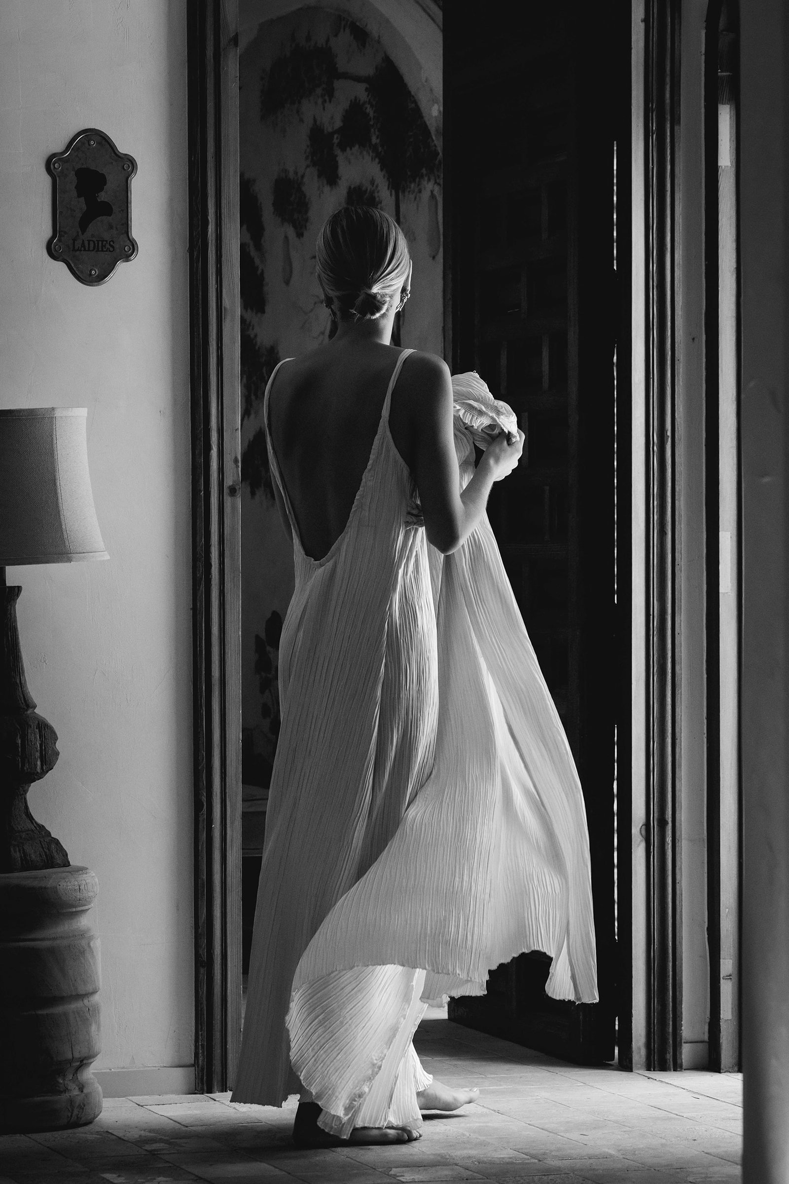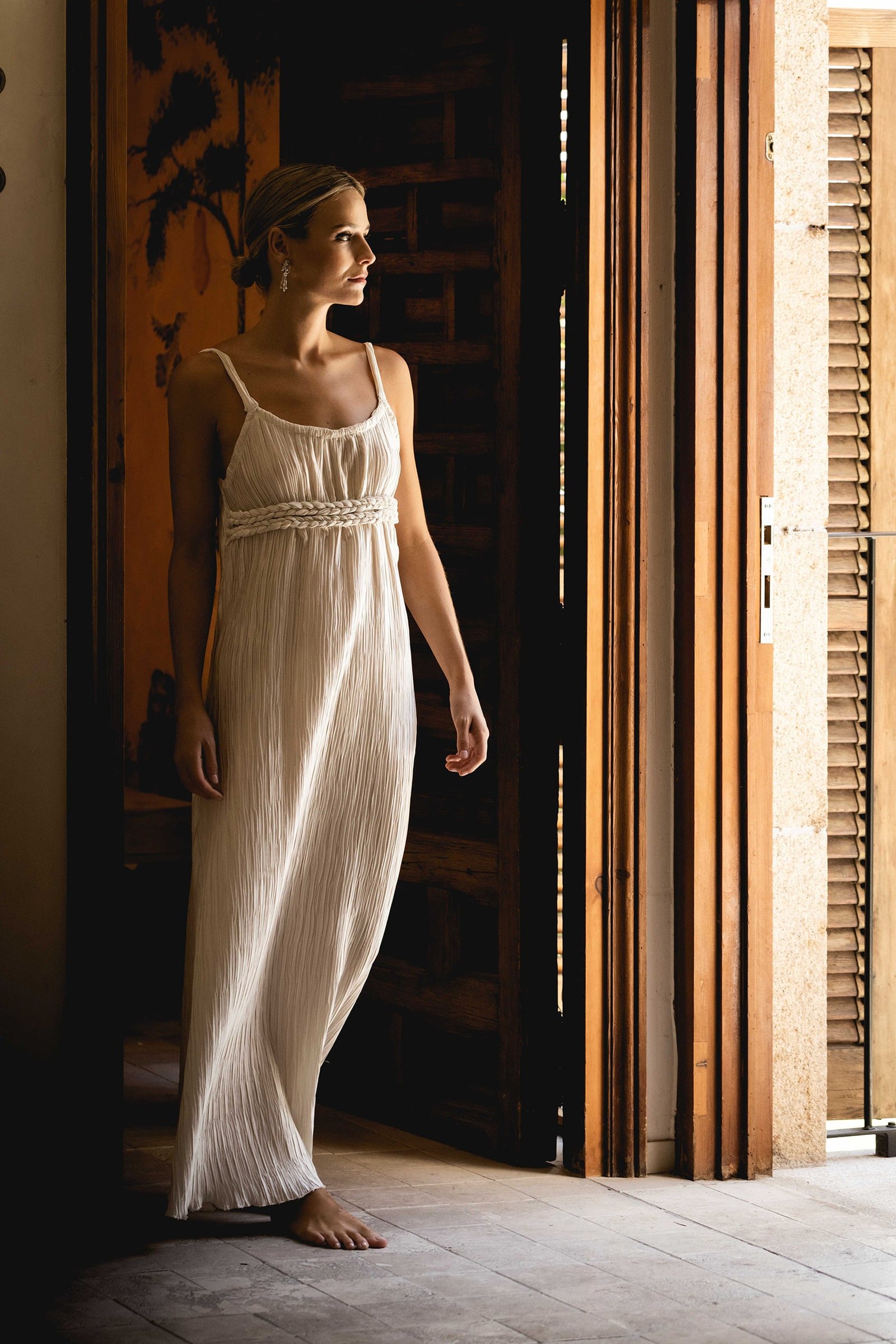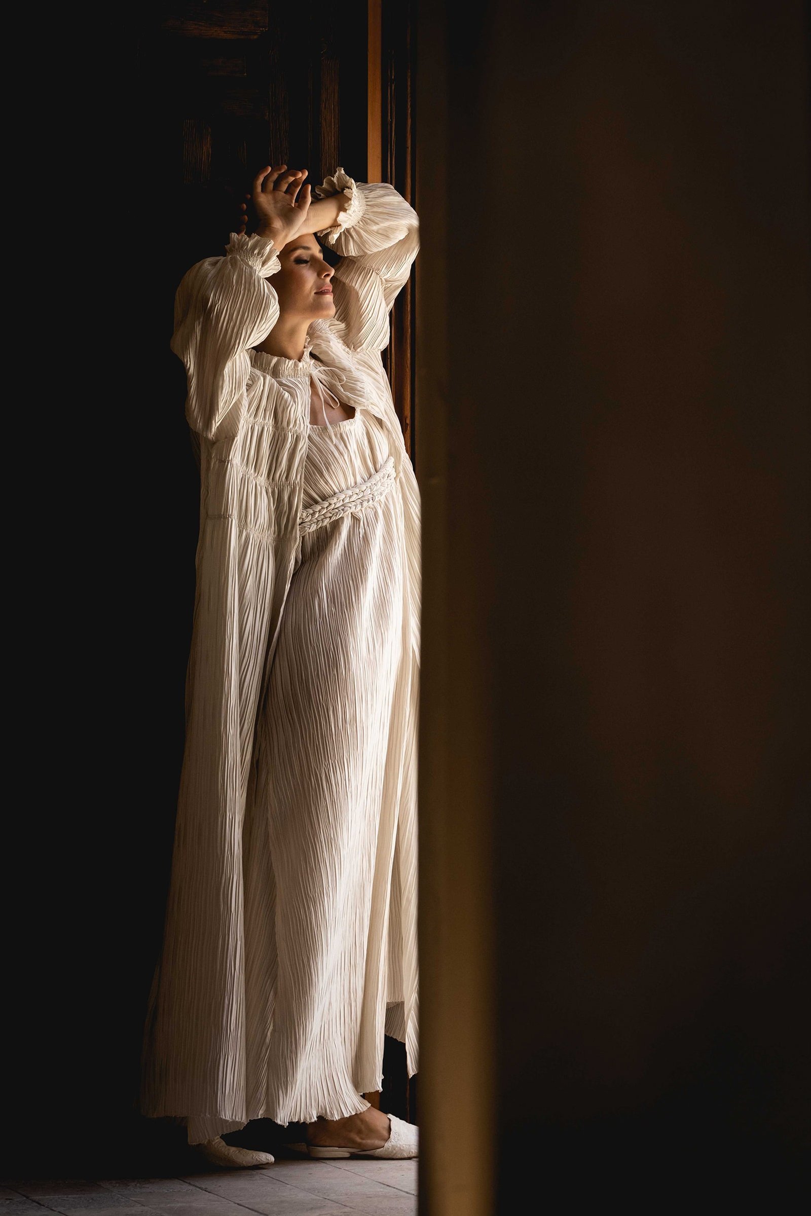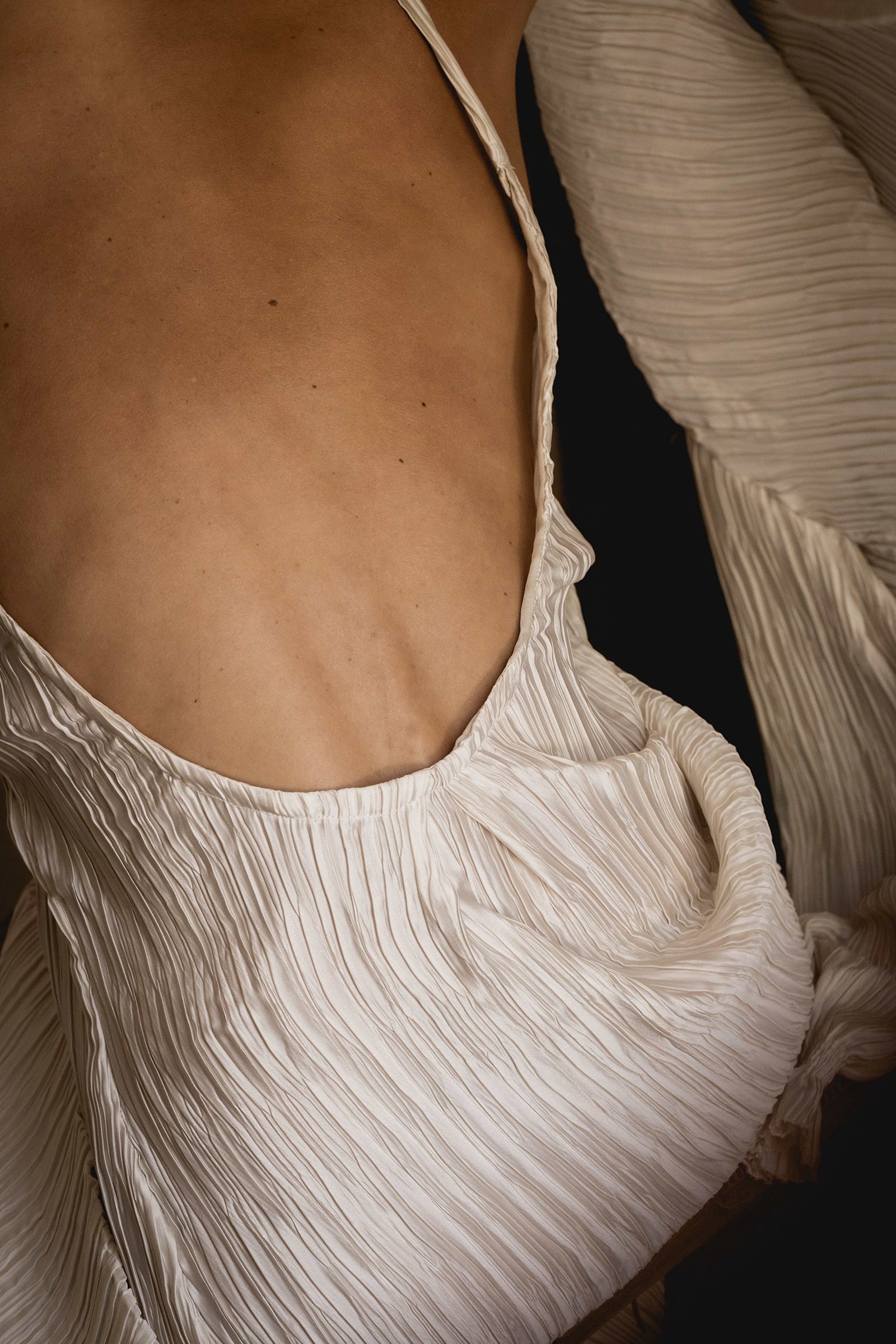- Camisón realizado en satén plisado con cuello redondo y espalda abierta