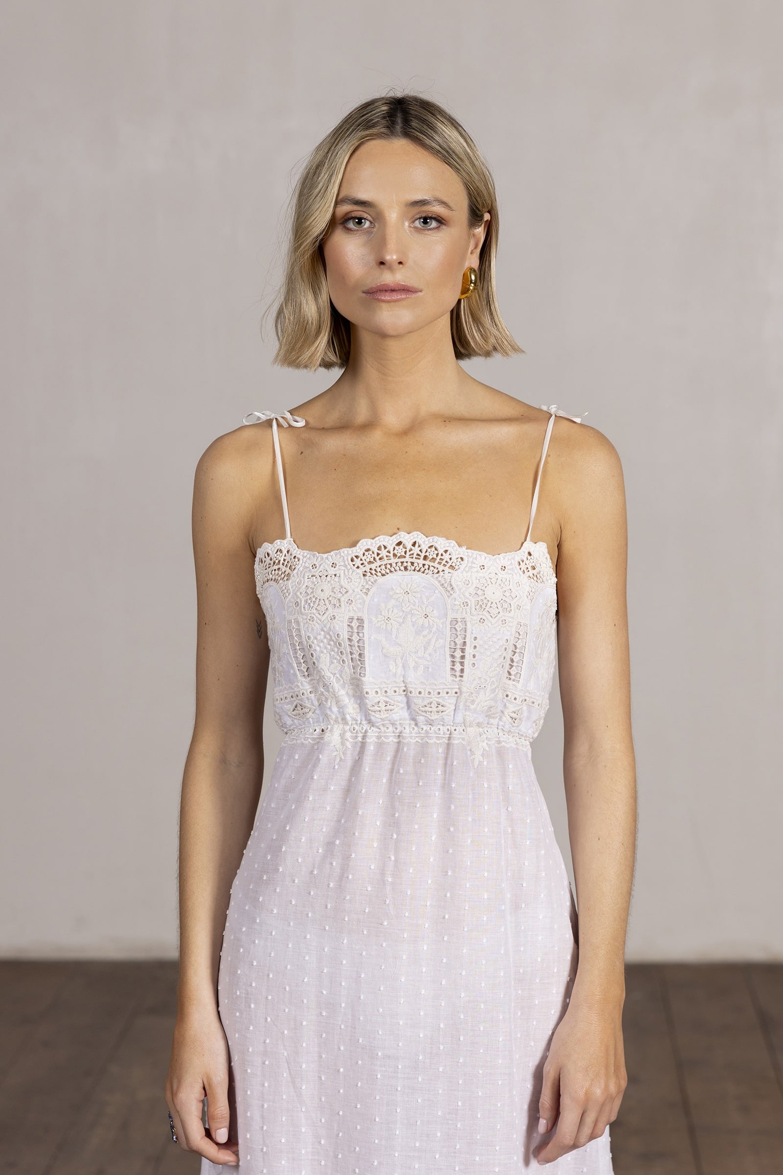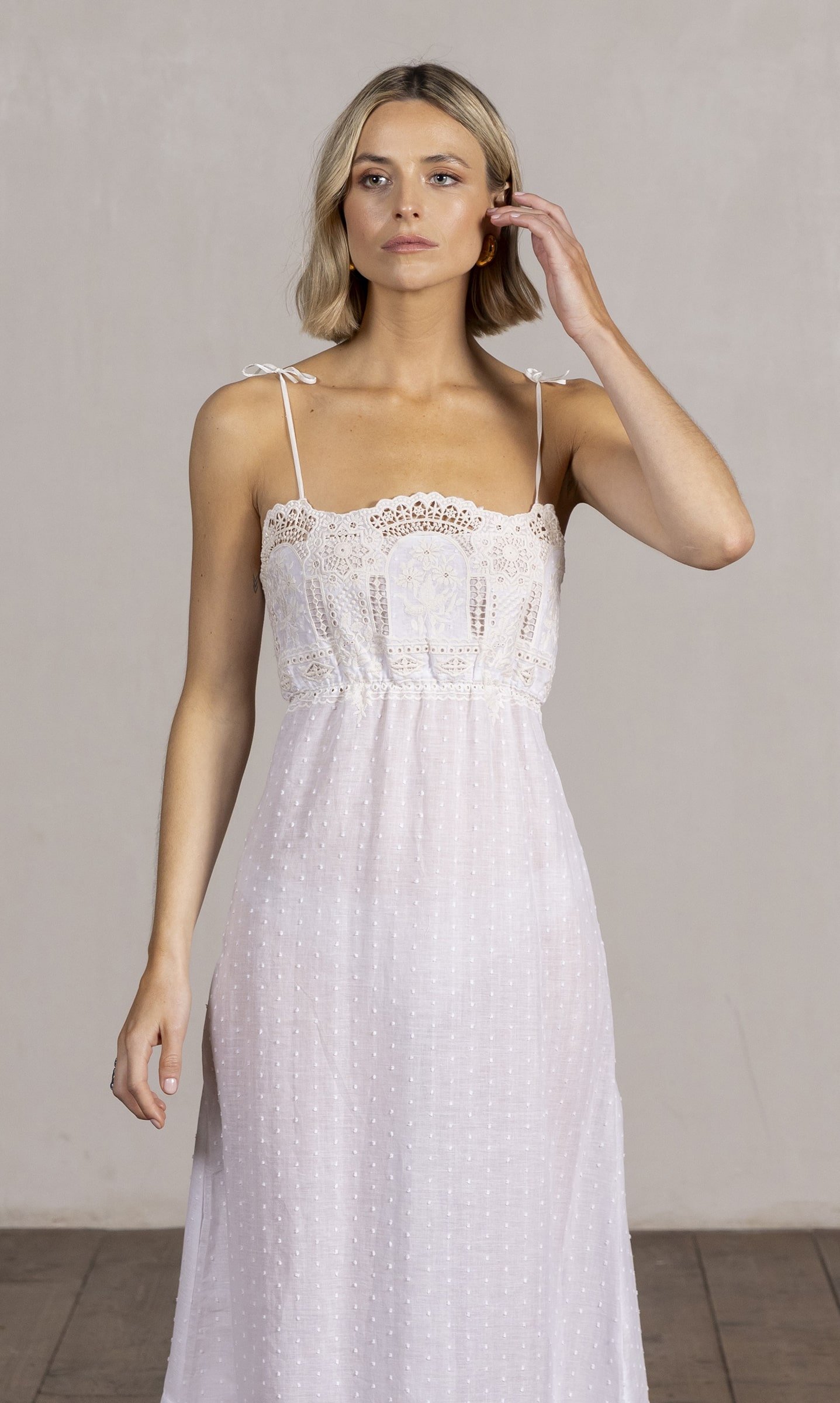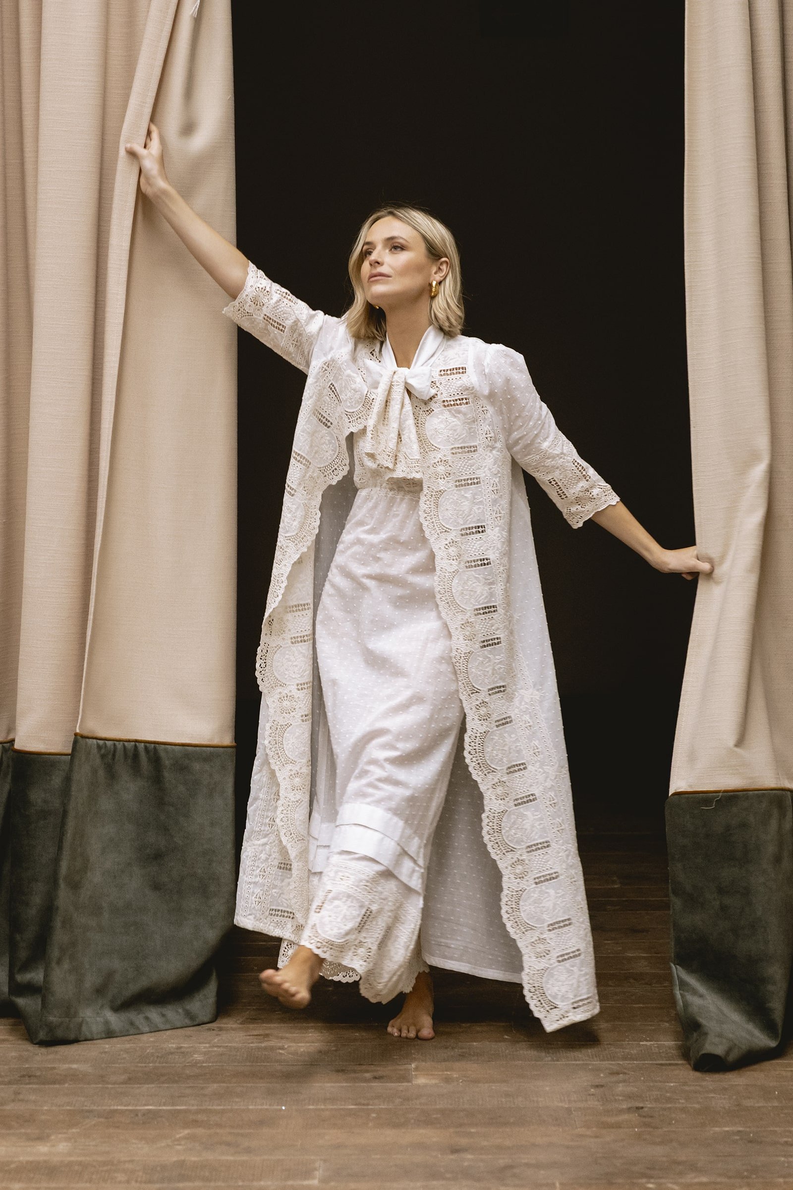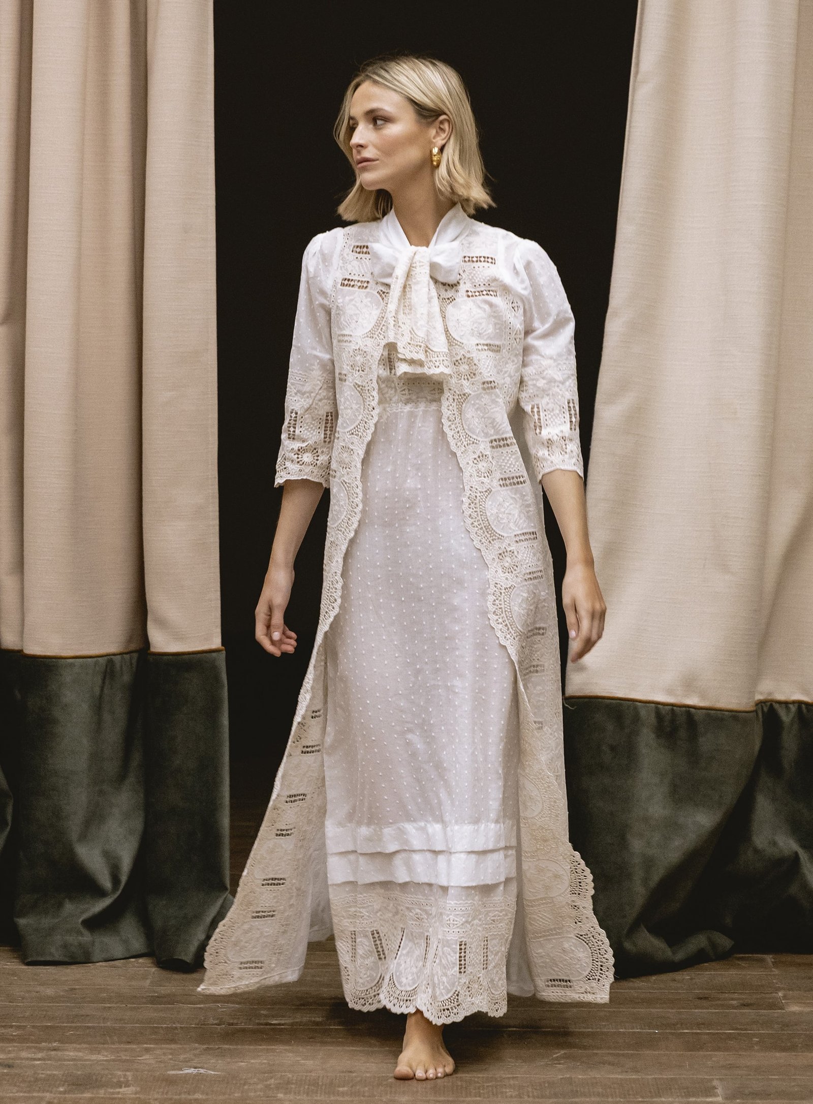 - Encantador camisón confeccionado en plumetti de algodón blanco con bordados en beige.