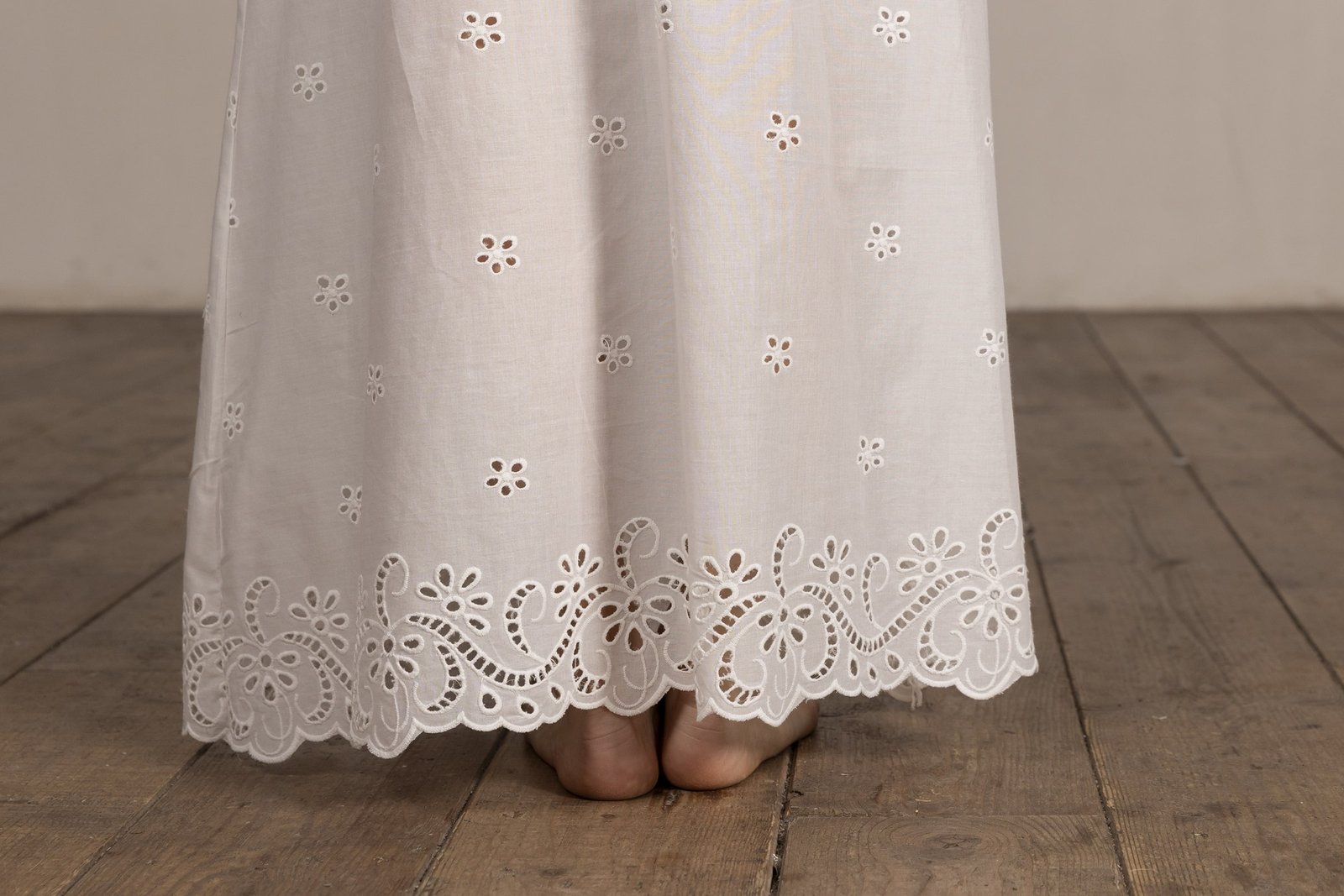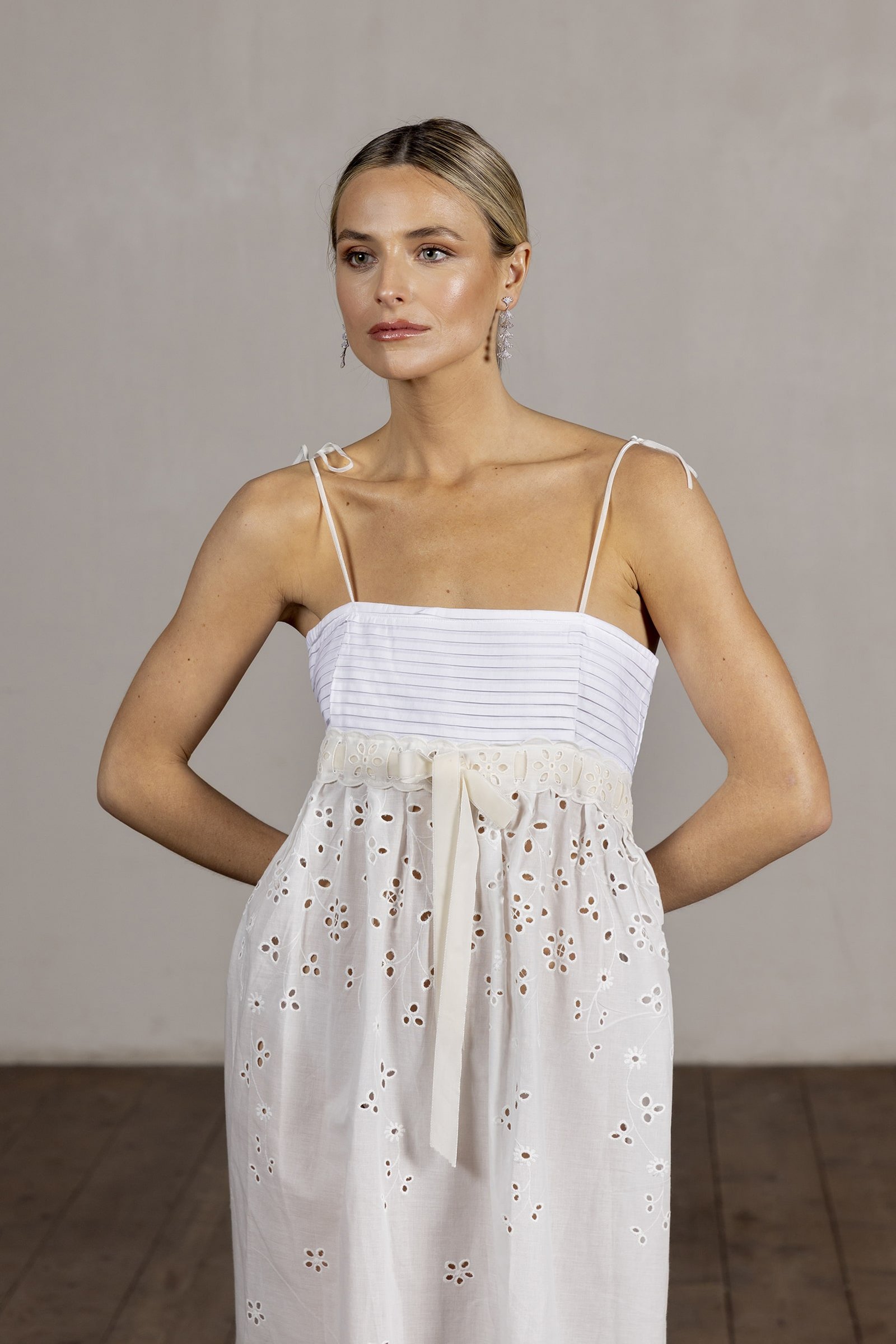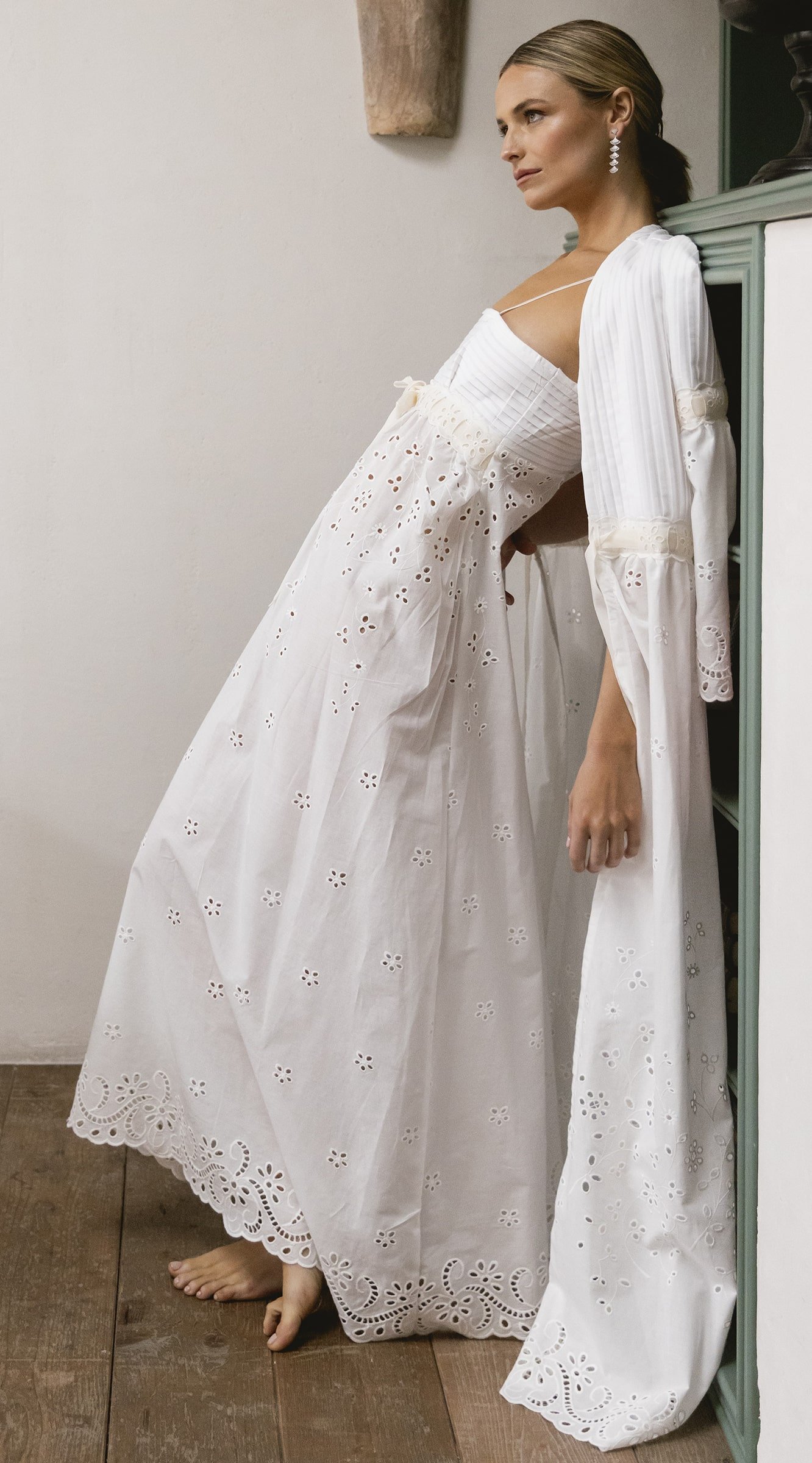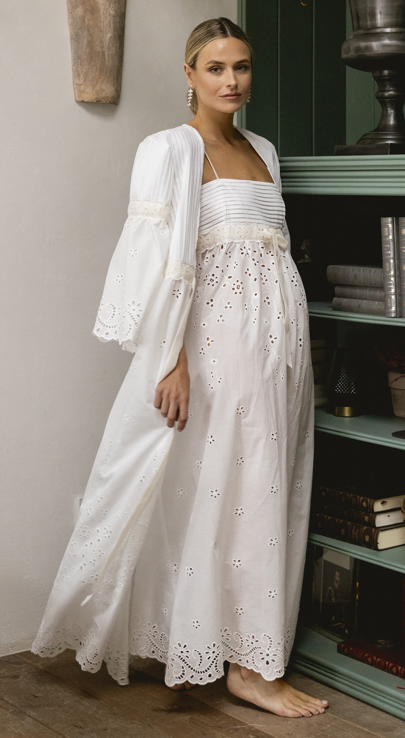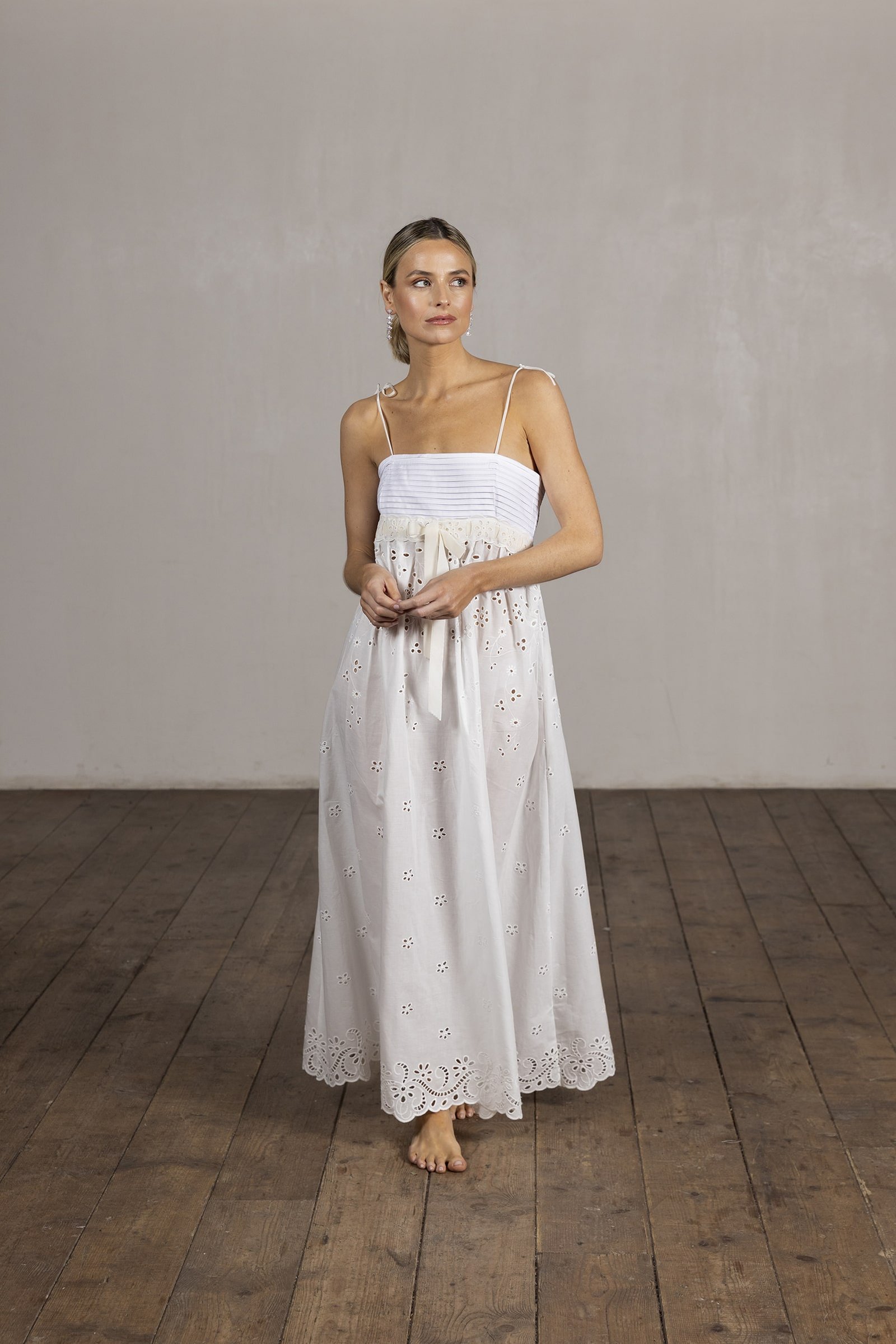 • Su diseño presenta un pecho en batista blanca con jaretas, un favorecedor corte debajo del pecho con entredos en color crudo y una falda con vuelo confeccionada en batista bordada en tono crudo.